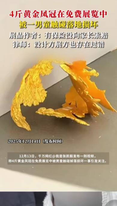 据潇湘晨报,12月13日,千万网红@我是张凯毅发布一则视频,称4斤黄金凤冠在免费展览中被男童触碰掉落损坏,引发关注。