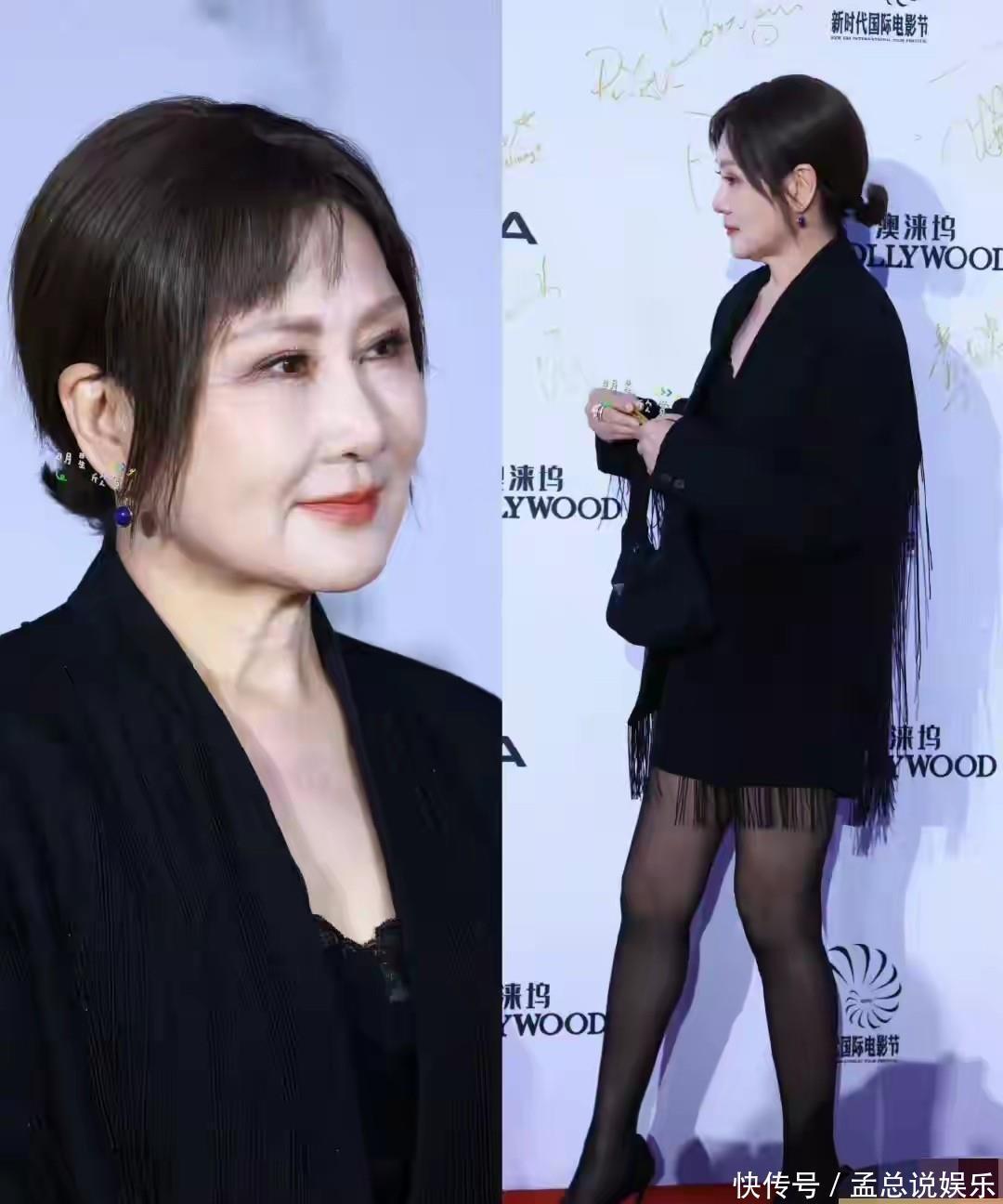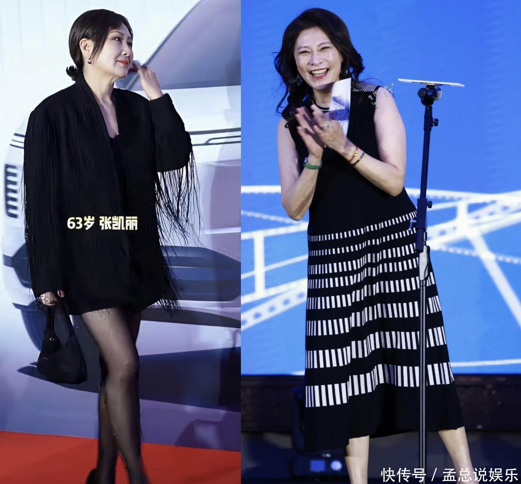同样是63岁,张凯丽则以黑色流苏西装短裙、黑丝袜搭配高跟鞋的造型亮相,看起来又老又年轻的感觉。
